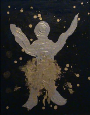 Krylon, graphite. Wax record, CD, paper, rubber, string, superglue, photo on canvas.
