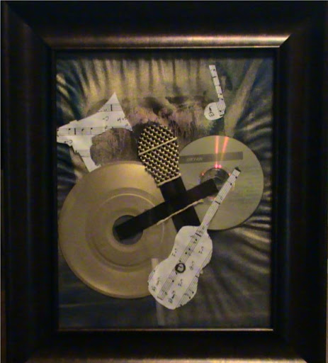 Krylon, graphite. Wax record, CD, paper, rubber, string, superglue, photo on canvas.