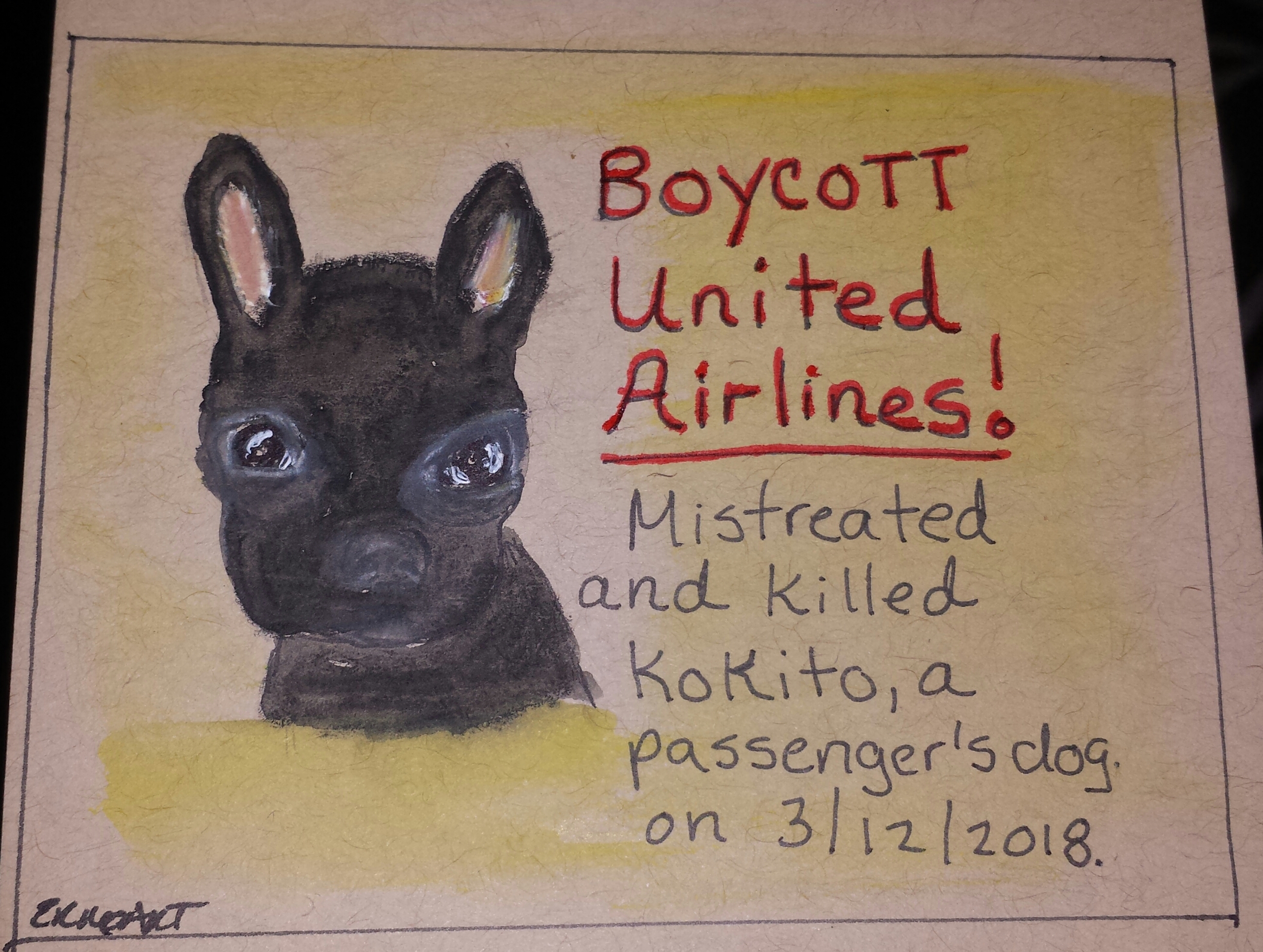 On March 12, 2018 a passenger’s dog was shoved into the overhead compartment, where he died. I drew this to show my support of #Kokito and his family and plan on boycotting United Airlines.